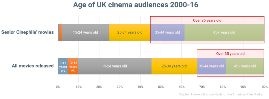 이 카테고리의 영화는 35세 이상의 관객이 약 55%로, 시장 전체의 약 22%와 비교하면 2배 이상으로 상당히 높은 비율을 차지합니다. 이러한 영화가 일반 영화와 얼마나 다른지 파악하려면 아래에서 영국 영화 관객과 관련된 인구통계학적 데이터를 참조하세요.