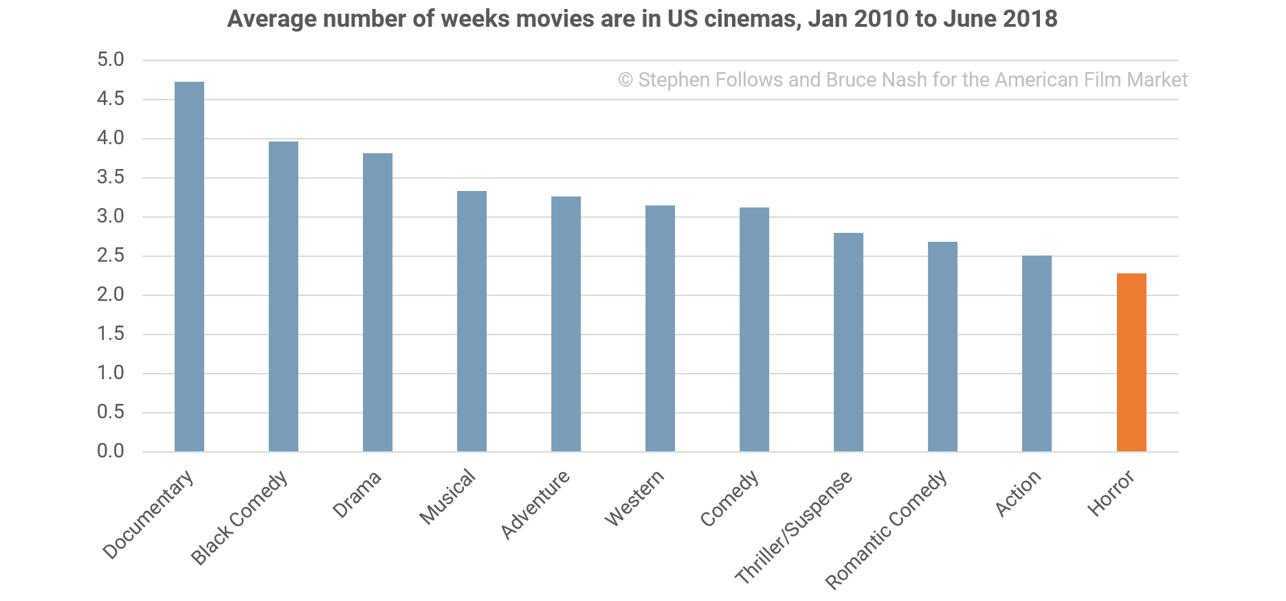 평균적으로 다큐멘터리는 거의 5주 동안 극장에서 상영되는 반면, 공포 영화는 그 절반의 시간 동안 상영이 중단됩니다.