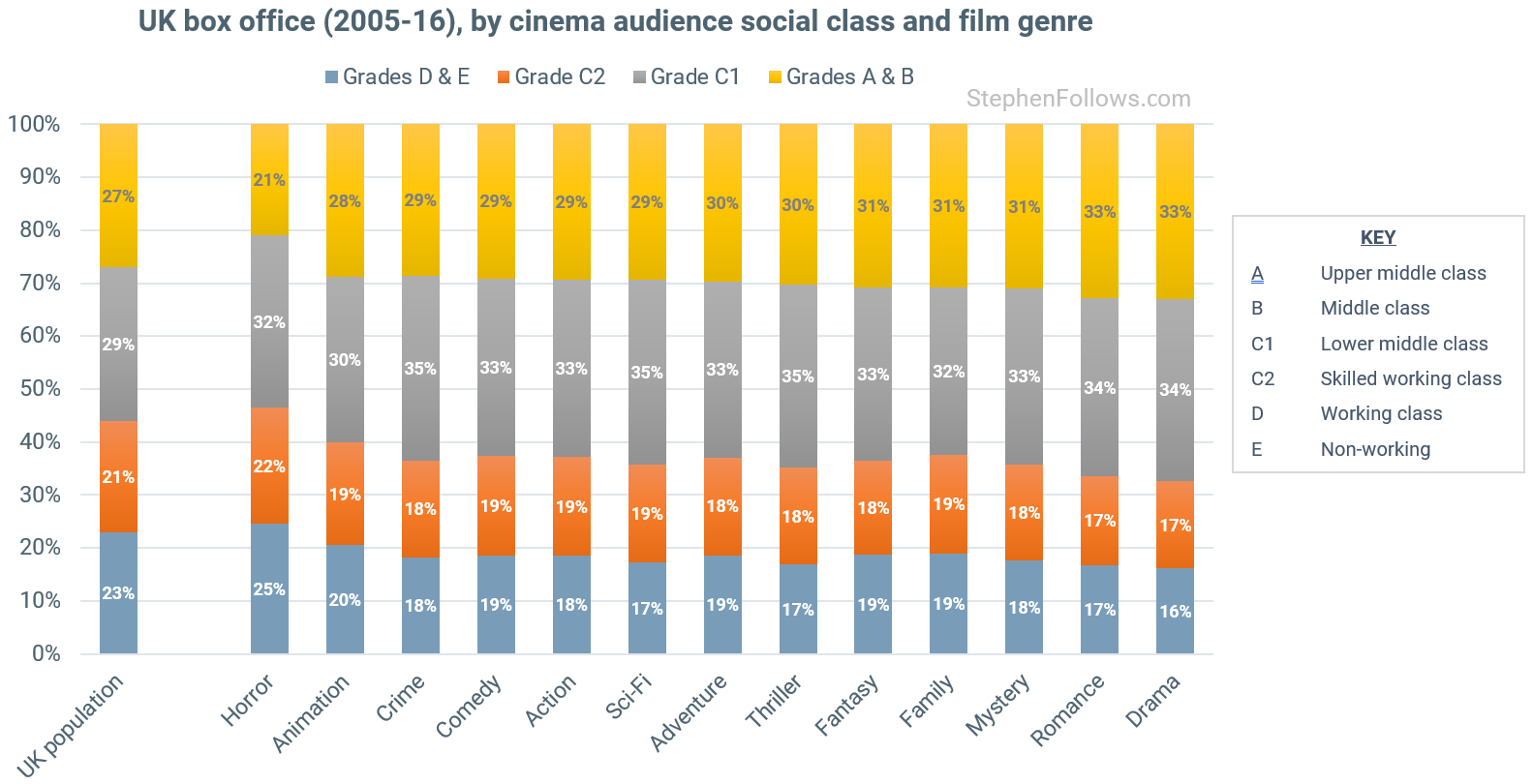 영국 영화 관객을 대상으로 한 출구 조사에 따르면, 공포 영화는 다른 모든 장르에 비해 계층 스펙트럼이 낮은 사람들이 불균형적으로 즐기는 것으로 나타났습니다. 공포 영화를 시청하는 사람들 중 21%만이 상위 2개 계층(즉, 'A'와 'B')에 속하는 반면, 드라마는 33%에 달합니다.