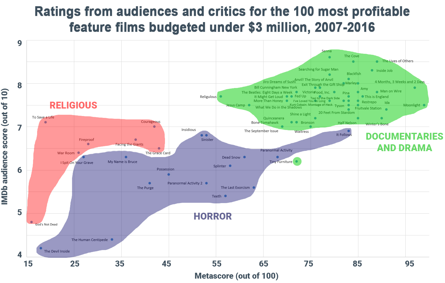 이 글의 2016년 버전에서는 2000~15년 개봉한 제작비 50만 달러에서 300만 달러 사이의 영화 중 제작자 순이익이 1,000만 달러 이상인 영화에 초점을 맞췄습니다. 이번 업데이트 버전에서는 포함 기준을 확대하고(예산이 300만 달러 미만인 모든 영화로), 더 많은 영화를 포함했으며(63편에서 100편으로), 기간(2007~2016년)을 좁혔습니다.