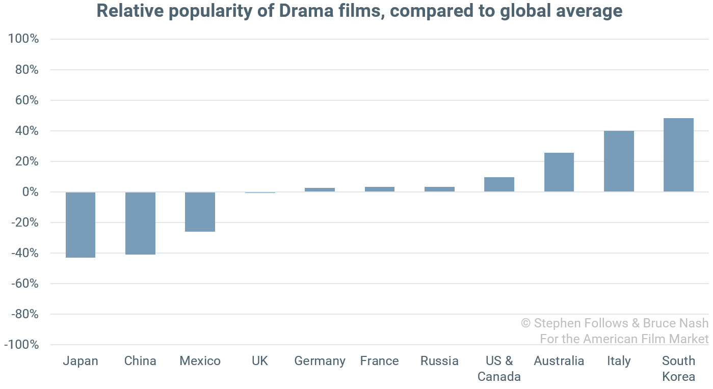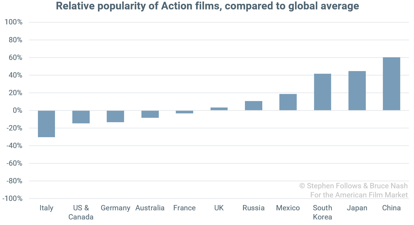 더넘버스의 전 세계 박스오피스 추적에 포함된 3,368편의 영화에 대한 극장 박스오피스 수익의 지역별 분석을 연구했습니다. 여기에는 2015년 초 이후 개봉한 대부분의 영화가 포함되며, 일부 데이터는 2012년까지 거슬러 올라갑니다. 각 장르의 글로벌 성과와 비교하여 지역 내 각 장르의 상대적 강점과 약점을 평가하는 공식을 개발했습니다(자세한 내용은 기사 말미에 나와 있습니다).