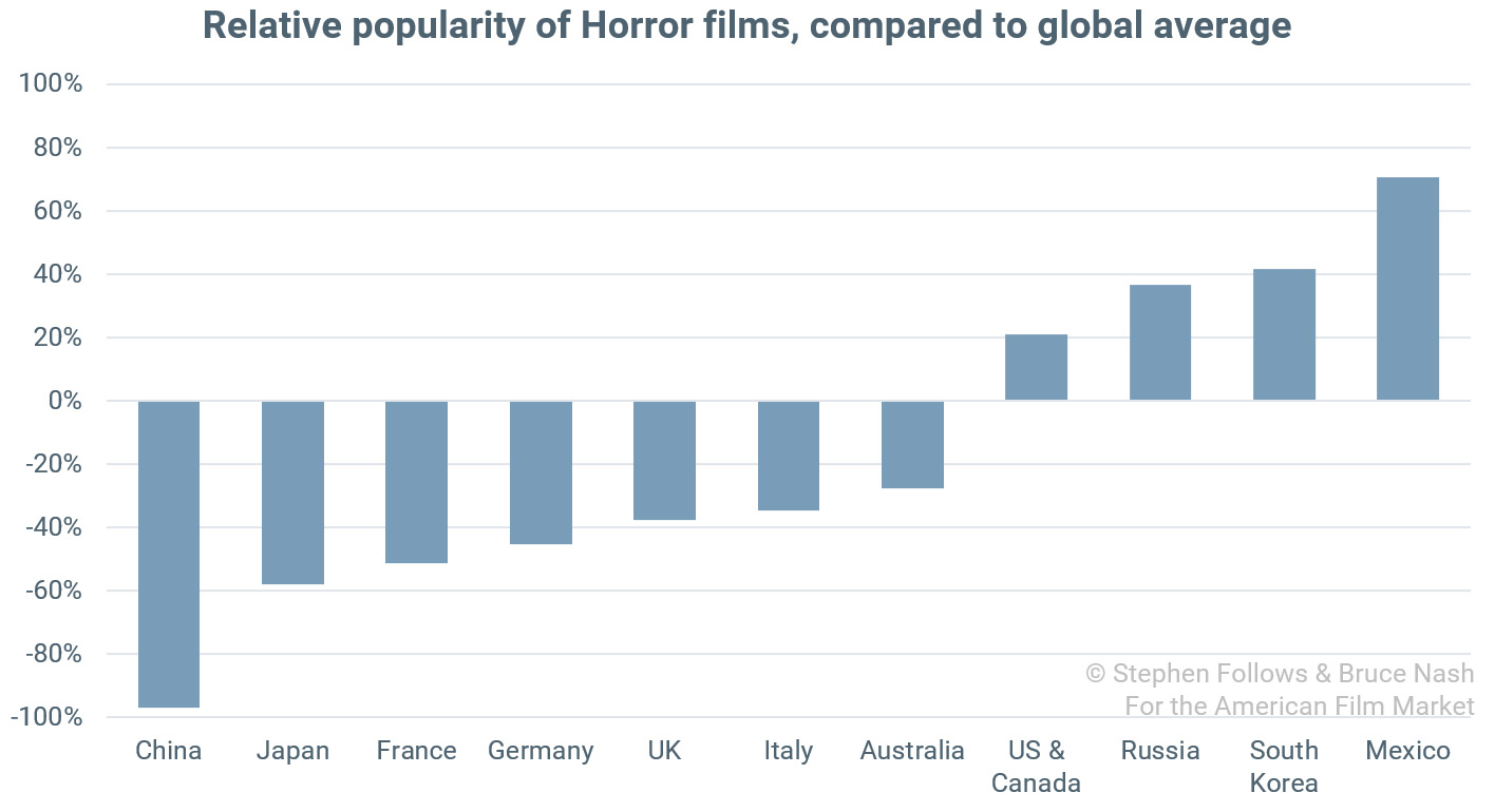 멕시코와 한국의 영화 관객은 호러 장르를 가장 좋아하는 반면, 일본과 중국에서는 호러 장르의 실적이 저조합니다.