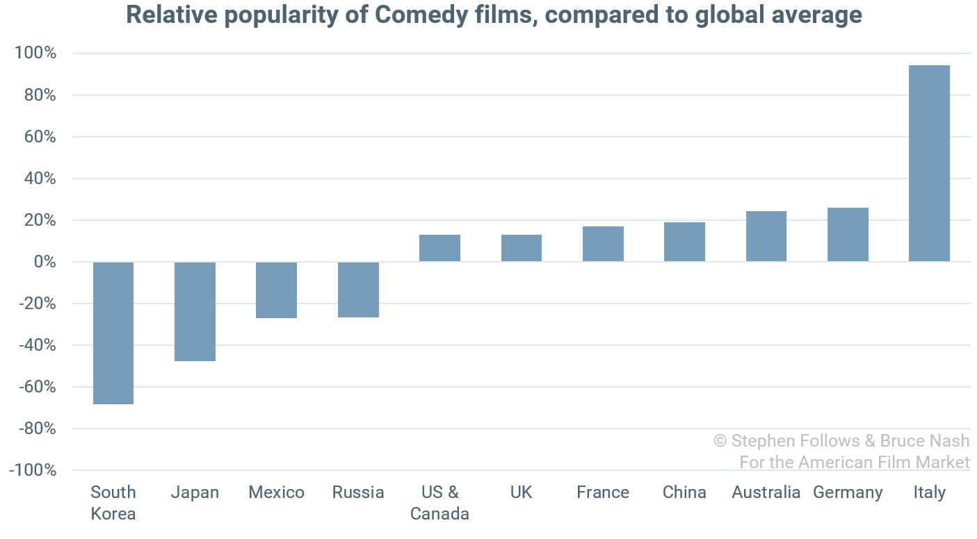 코메디아 델라르테와 로베르토 베니니의 탄생지인 이탈리아는 코미디의 본고장이며, 큰 차이로 코미디의 본고장이라고 할 수 있습니다. 전체 박스오피스에서 코미디 영화가 차지하는 비중은 다른 나라에 비해 이탈리아에서 약 2배 더 높습니다.