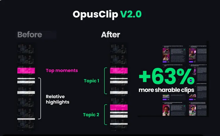 Opus Clip은 OpenAI의 GPT-4로 구동되는 독점 큐레이션 모델을 사용하여 긴 형식의 영상을 분석하고, 영상의 여러 부분에서 황금 덩어리를 골라낸 다음 크리에이터가 직접 공유할 수 있는 바이럴 짧은 클립으로 매끄럽게 재배치하도록 프로그래밍되어 있습니다.
