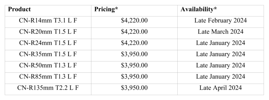 RF 마운트가 장착된 새로운 CN-R 시네 단렌즈는 2024년 1월 말부터 24mm, 35mm, 50mm, 85mm 초점 거리로 단계적으로 출시될 예정입니다. 이어서 2024년 2월 말에는 14mm, 2024년 3월 말에는 20mm 렌즈가 출시될 예정입니다. 마지막으로 출시되는 렌즈는 2024년 4월 말에 135mm 초점 거리입니다.