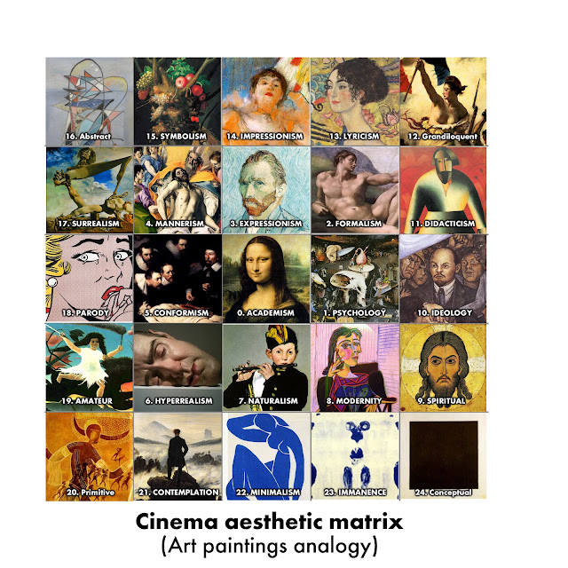 영화에서 미적 스타일의 이름은 회화의 미적 스타일과 완전히 겹치지 않으며, 각 "단계" 사이의 연속성과 전환이 특정 평면에서 작동하기 때문에 조형 스타일 지도는 이와 같이 정확하게 보이지 않을 것입니다: 회화의 경우 조형적 표현과 주제, 영화는 시각적(촬영 스타일, 조명 스타일, 세트 스타일, 의상 스타일)뿐만 아니라 4차원의 시각(편집 스타일), 연기 스타일, 대화 스타일, 사운드스케이프 스타일(악보 스타일, 오디오 캡처 스타일) 및 주제를 고려해야 하기 때문입니다.