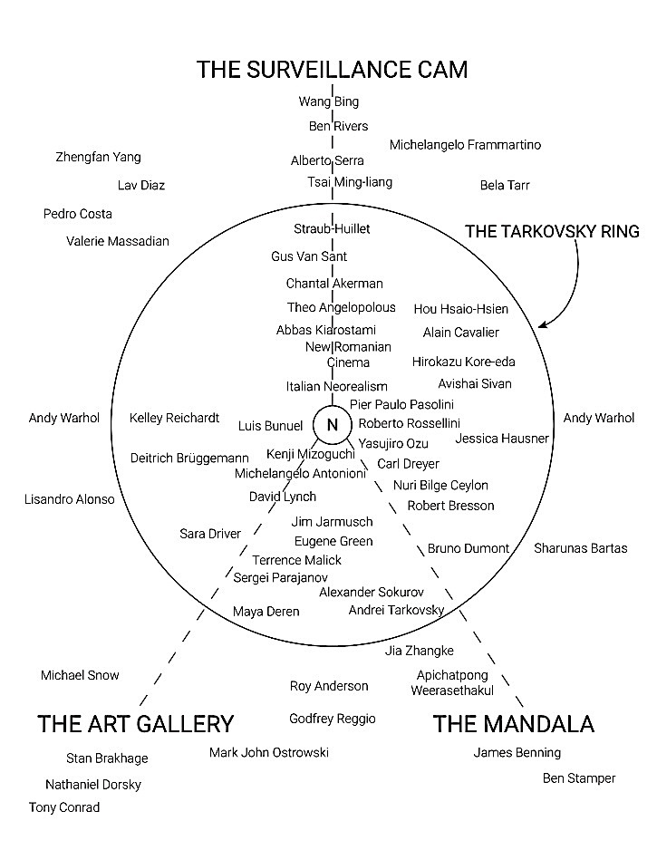 위 도표에 등장하는 수십 명의 영화감독들은 다양한 문화와 시대에 속해 있지만 공통점이 무엇일까요? 안드레이 타르코프스키, 짐 자무쉬, 피에르 파올로 파솔리니, 테렌스 말릭 등 일반 영화 관객도 쉽게 떠올릴 수 있는 이름 중 일부는 시네필이 좋아한다는 간단한 연관성을 암시할 수 있습니다. 물론 모든 시네필이 모든 감독을 좋아하는 것은 아니며, 실제로 지금 이 순간에도 상대적인 장점에 대해 격렬한 논쟁이 벌어지고 있습니다. 하지만 어떤 식으로든 영화를 예술 형식으로 진지하게 받아들이는 사람들, 특히 현존하는 가장 진지한 시네필 중 한 명인 폴 슈레이더는 이들 모두를 감독으로 진지하게 받아들입니다.
