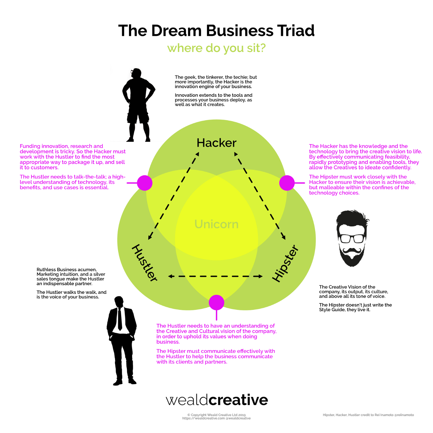 하지만 힙스터는 창의적인 디자인과 멋진 요소를, 해커는 기술 솔루션의 유틸리티 벨트를, 허슬러는 이 모든 것을 포장하여 판매 및 파트너십의 형태로 대중에게 제공할 수 있는 올바른 방법을 찾는다. 셋을 합치면 불패의 조합이 된다.