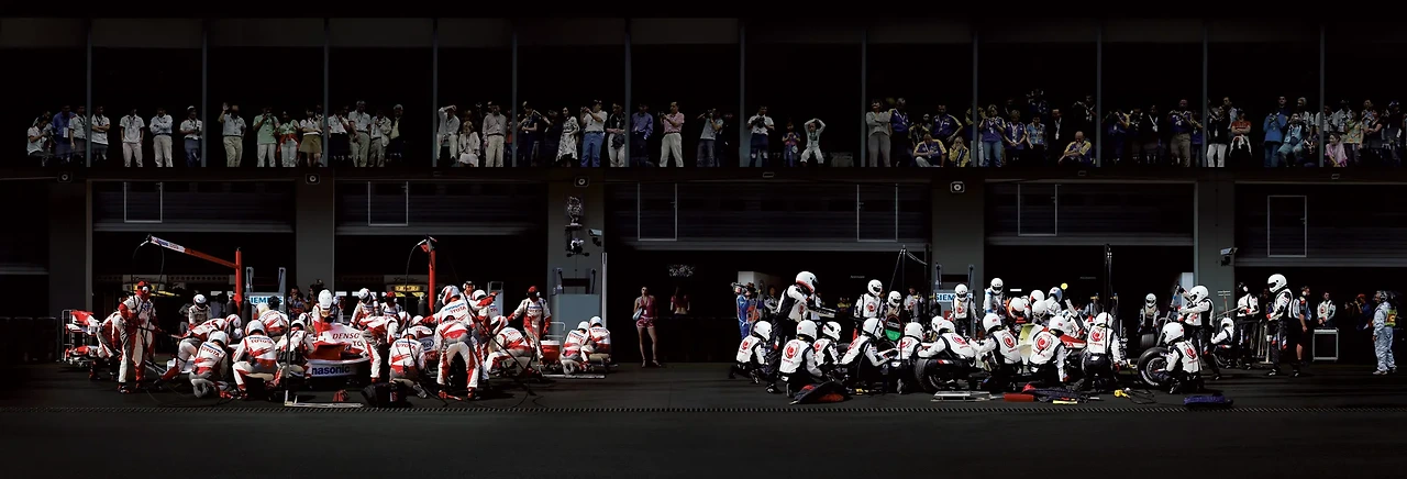 포뮬러 원 경주의 피트 스톱을 포착한 이 작품은 속도와 정밀성의 발레를 보여준다. 기계와 인간이 완벽하게 동조하는 순간은 미래주의자들이 꿈꾸었던 기계 시대의 이상을 실현한다. 하지만 이 완벽한 조화는 극도로 통제된 환경에서만 가능하다는 한계를 동시에 드러낸다.