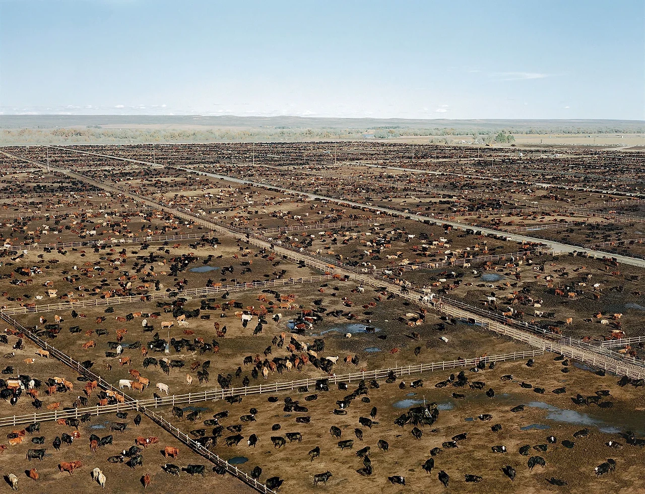거대한 축산 농장을 담은 이 작품은 푸드 시스템의 산업화를 다룬다. 수천 마리의 소들이 만드는 추상적 패턴은 아름답지만, 동시에 생명의 상품화라는 어두운 현실을 감춘다. 잭슨 폴록의 액션 페인팅을 연상시키는 형태적 유사성은 의도적 아이러니로 읽힌다.